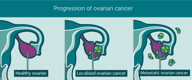 Faktor resiko. Riwayat keluarga sangat berpengaruh. Setidaknya seorang wanita beresiko 3x lipat menderita kanker ovarium jika ibu, anak perempuan atau saudara perempuan pernah atau menderita kanker ovarium. Hal ini bisa terjadi karena mutasi gen BRCA1 dan BRCA2 yang meningkatkan risiko kanker ovarium.Pada wanita yang mempunyai mutasi gen BRCA1 atau BRCA2 umumnya akan mengembangkan kanker ovarium sebelum usia 50 tahun. Selain itu, penggunaan obat kesuburan, terapi pengganti hormon setelah menopause dan obesitas menjadi juga menjadi pemicu berkembangnya kanker ovarium.Namun secara umum, risiko meningkat seiring bertambahnya usia.